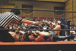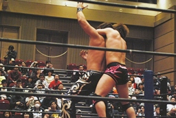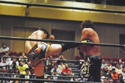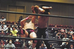 佐々木ダイビングクロスボディ(左写真)、カウント2。ロープに振る、石井切り返す、佐々木ブロック、トップロープに引っ掛けてドロップキック、カウント2。