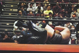 佐藤タックル(右写真)、佐々木はネックロックに。佐々木バック取る、佐藤巻き込んでグラウンドに。