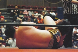 HARASHIMAソバット、ハイキック、ファルコンアロー(右写真)、カウント2。佐々木にタッチ。