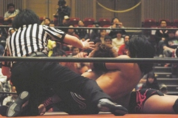佐々木キャッチしてNOW or NEVER(右写真)、佐藤がカット。HARASHIMAが佐藤を場外に出す。