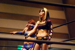 佐藤をロープに振って美央がヒザ蹴り、華名がフェースクラッシャー(右写真)。