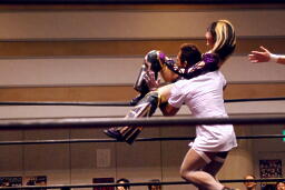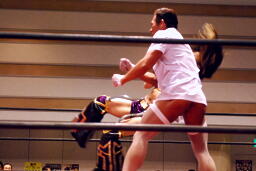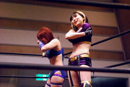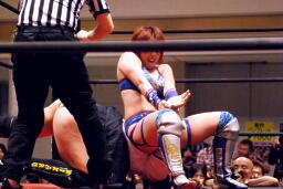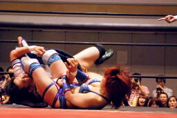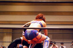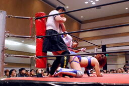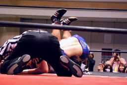 佐藤はマイケルにタッチ。マイケルはヘンタイスライド(右写真)、バックも。そしてアトミックドロップ。美央「マジで尻痛い!」マイケルは佐藤にタッチ。