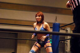 マイケルコーナーに振って突っ込む、美央カウンターのキックからスイングDDT(右写真)。バズソーキックはマイケルブロック。