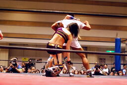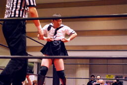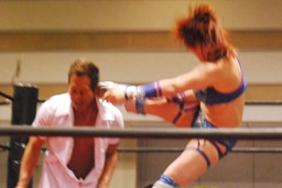 マイケル「熱くなって来たぞ〜」とナース服を脱ぎ出すが引っかかって脱げない。そこに華名がローキック(左写真)。さらにハイキック。マイケルかわしてバックフリップ、カウント2