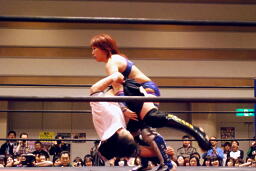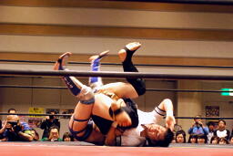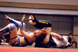 佐藤巻き込む(左写真)華名上になる。十字狙うが佐藤ブロック。首の取り合い、ブレークして両軍タッチ。
