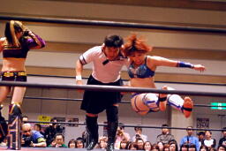 佐藤とマイケルダブルでロープに振る、華名入ってダブルのドロップキック(左写真)。