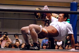 対角線コーナーに振ってマイケルが串刺しエルボー、佐藤串刺しラリアット。佐藤は股裂きに(右写真)。その様子を喜んで撮影する今成夢人。美央「コラ撮るな!ひどいよ〜。」
