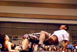 マイケル「アイアンマンは俺のものだ!必殺、首固め!」美央が急所打ち(右写真)。