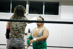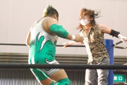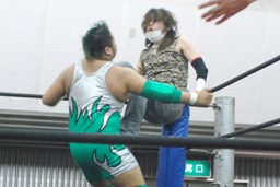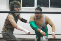 ニラコーナーに振る、入江切り返して串刺しラリアット、ニラかわしてDJタイム(右写真)。