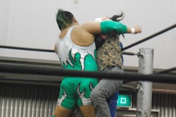 ニラすがりつくように立ち上がるとヘッドロック(右写真)。