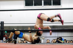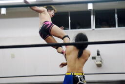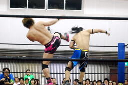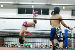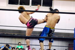 石井トラースキック、片足ドロップキック。コーナーに上ってミサイルキック(右写真)、カウント2。