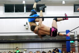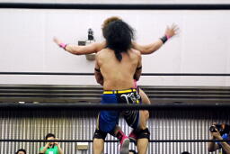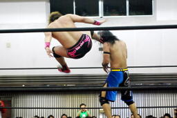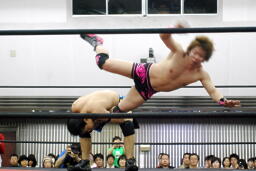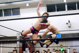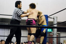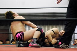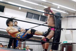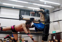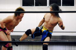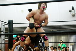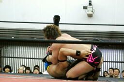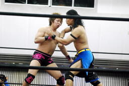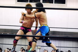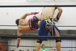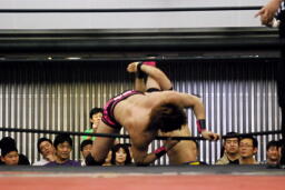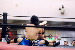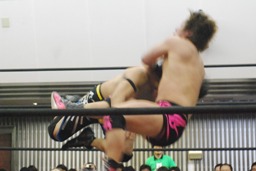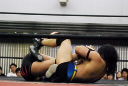 彰人ベリートゥバック狙う、石井ブロック。彰人スクールボーイ、石井が立ち上がったところをカニばさみでロープに突っ込ませる(左写真)、