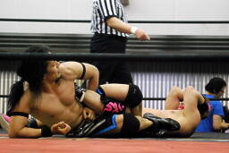 しかし石井も前転してエビ固めに(右写真)、カウント2。