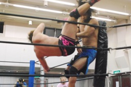 彰人ロープに飛ぶ、石井キャッチしてスリーパー、彰人は持ち上げて開脚式ニークラッシャー(右写真)