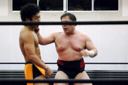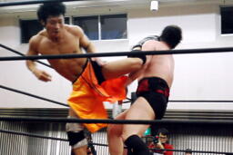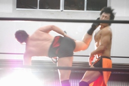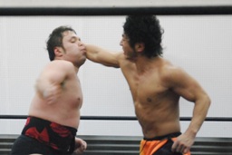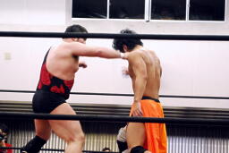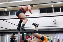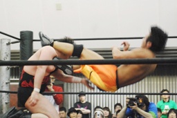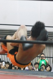 アントンコーナーに上ってダイビングフィストドロップ、高梨は足を伸ばして迎撃(左写真)。