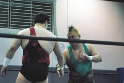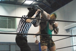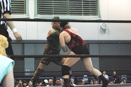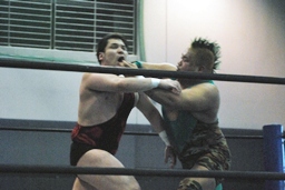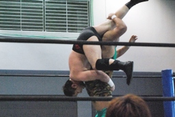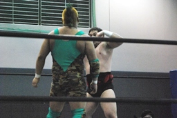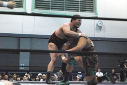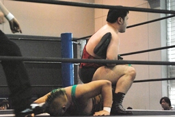 ロックアップ(左写真)、入江ぶん投げる。再度ロックアップ、入江ロープに押しこむ、ブレーク。