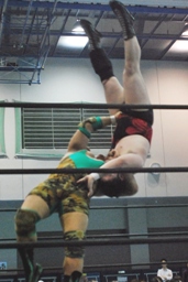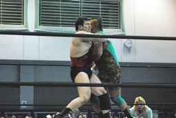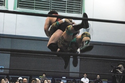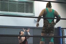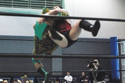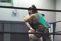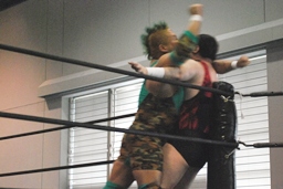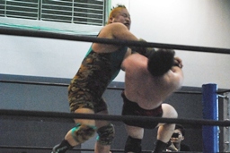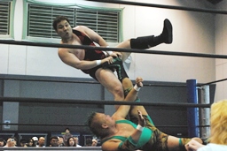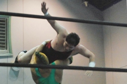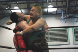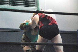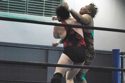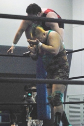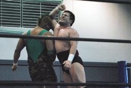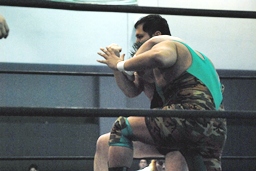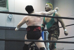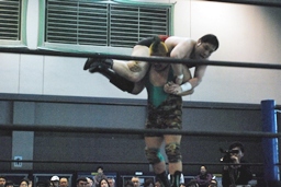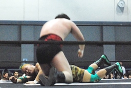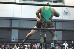 アントンロープに飛ぶ、入江キャッチしてパワースラム(左写真)。