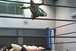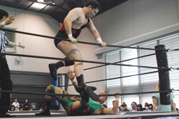 入江コーナーに上ってダイビングボディプレス(左写真)、カウント2。