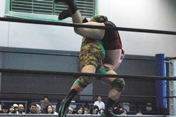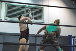 アントンコーナーからダイビングクロスボディ(左写真)。
