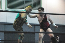 ロックアップ、アントンニーリフト、パンチ、入江ブロックしてエルボー(右写真)。もう一発エルボー、アントンダウン。