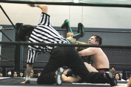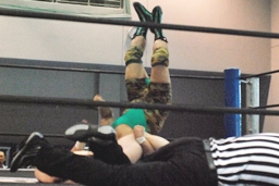 入江は木曽レフェリーを起こして再度自分が垂直落下式バックフリップ狙う、アントン回転エビ固めに切り返す(右写真)、