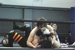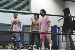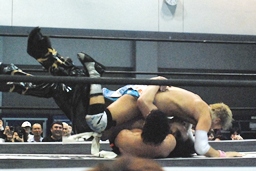 高梨腕を取る、ディーノ高梨のバック取る(右写真)。タイツに手を入れる。大石とKUDOがリングイン。