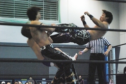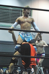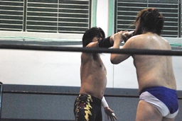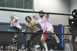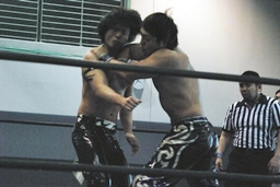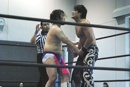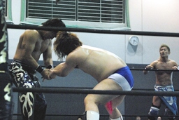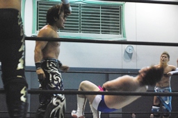 HARASHIMAがカットに入るが大石はかわして回転エビ固め、HARASHIMAはディーノに捕まる(左写真)。高梨2で返す。大石はKUDOにタッチ。5分経過。
