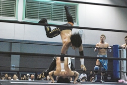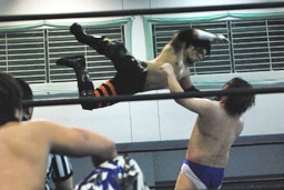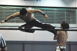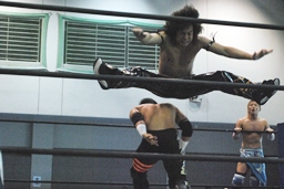 先発は佐々木とKUDO。バックの取り合い、ロープワーク、KUDOリープフロッグ(右写真)。