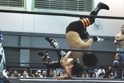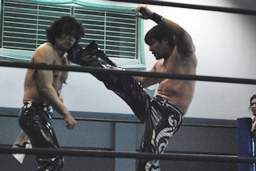 HARASHIMAコーナーに振る、KUDO切り返す、HARASHIMAエプロンに。KUDO突っ込む、HARASHIMAハイキック、コーナーに上って「チェストー!」ミサイルキック(左写真)。