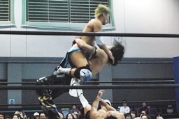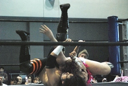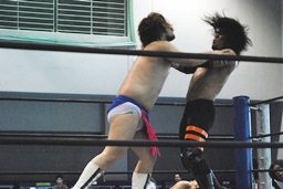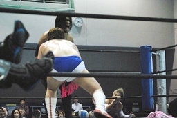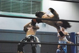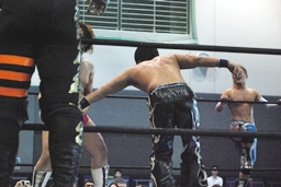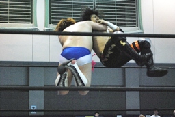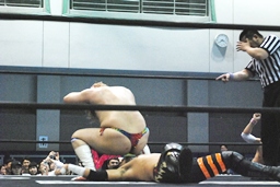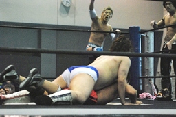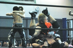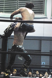 そして男色ナイトメア(右写真)、HARASHIMAがエルボー、ディーノ佐々木の顔面に座る、カウント2。