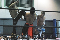 ロープに振ってKUDOのミドルキックと大石のエルボーの合体攻撃(左写真)。
