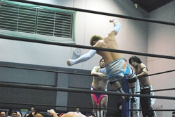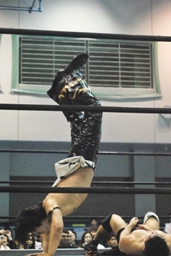 ディーノコーナーに振って突っ込む、佐々木エルボー、コーナーに上ってダイビングクロスボディ(右写真)。