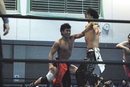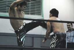 KUDOミドルキック、高梨逆水平(左写真)、KUDOコーナーに詰めてヒザ蹴り、大石にタッチ。
