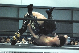 HARASHIMAコーナーに上げて雪崩式ブレーンバスター狙う、KUDOは回転エビ固めの形で着地すると(右写真)、