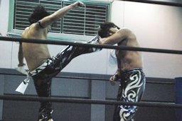 ミドルキックの打ち合い(左写真)。