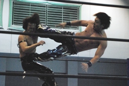 KUDOロープに飛ぶ、HARASHIMAジャンピングハイキック(右写真)。佐々木とディーノにタッチ。