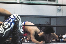 KUDOボディスラムから倒立式ダブルニードロップ(右写真)、カウント2。バックの取り合い、高梨がロープに押し込む、佐々木がキャッチしてロープスタナー、そのスキに高梨はHARASHIMAにタッチ。KUDOもディーノにタッチ。