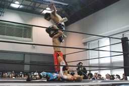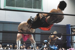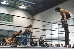高梨が大石の背中に飛び乗る(右写真)。HARASHIMAと佐々木はKUDOとディーノを場外に落としてプランチャ競演。