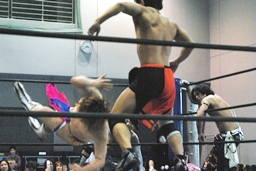 高梨入ってトラースキック、ドロップキック(左写真)、カウント2。