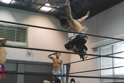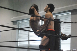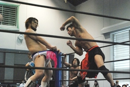 ほもクロはフォーメーションAに。高梨をコーナーに振るとまず大石が串刺しラリアット(右写真)、