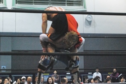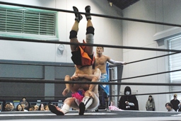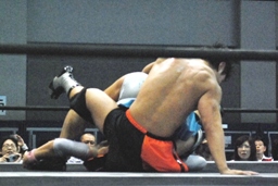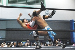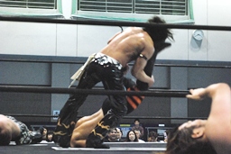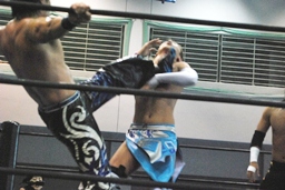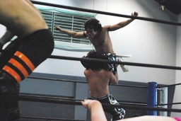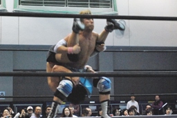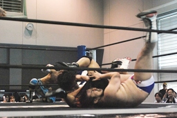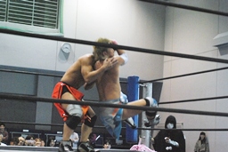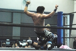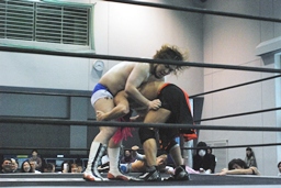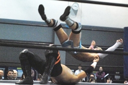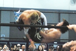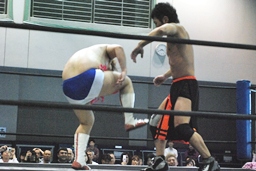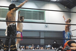 佐々木がKUDOにフランケンシュタイナー(右写真)、ディーノが佐々木にシャイニングあてがい。