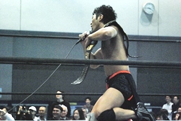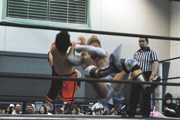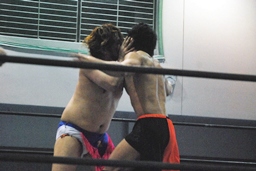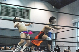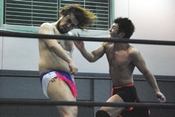 ファイト・一発、高梨タイツに誘い込まれる(左写真)、しかし足を取らせてキャッチ延髄に。HARASHIMAと大石にタッチ。10分経過。
