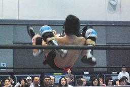 高梨が起き上がったところにKUDOダイビングダブルニーアタック(右写真)、大石カバー、HARASHIMAがカット。