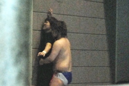 高梨もう一発トラースキック、ディーノキャッチして股間をつかむと男色スクリュー(右写真)。