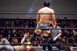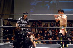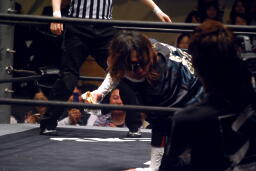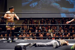 ニラはカウント9でロープにつかまって立ち上がる(右写真)。