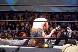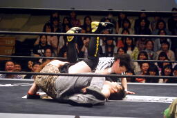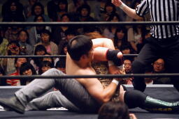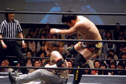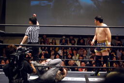 佐藤足で踏みつけてフォール、ニラかすかに右肩を上げる(右写真)。