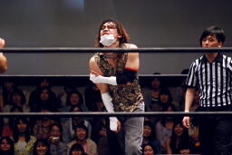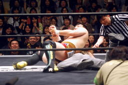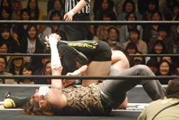 状態を起こして変形の逆エビ固めに(左写真)、佐藤ロープ。ついにエスケープを奪われた!