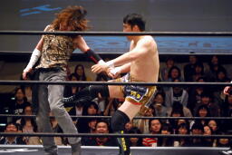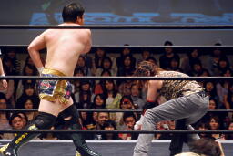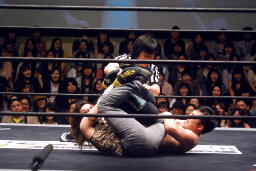 佐藤背中にストンピング、腕固め(右写真)。絞り上げるがリリース。