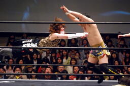 ニラジャンプ、佐藤は顔面ガードするがニラは佐藤の足にジャンピングローキック(左写真)。これは読めず。