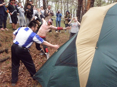 HARASHIMA、高尾も入り狭いテントで6人乱闘(右写真)。